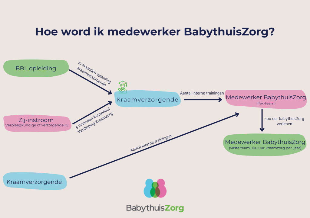 Heb je het keuzedeel Verdieping Kraamverzorgende behaald, dan kun je starten met de trainingen voor medewerker BabythuisZorg. Je blijft nog steeds werken als kraamverzorgende, waarvan je minimaal 100 uur per jaar wordt ingezet als medewerker BabythuisZorg. Je volgt dan de Basistraining BabythuisZorg om als medewerker BabythuisZorg aan de slag te kunnen. Dit gaat in totaal om vier modules. In de tijd dat je deze trainingen volgt, kom je te werken in een regioteam binnen de kraamzorg, daarnaast kom je in het flexteam van BabythuisZorg. Na het afronden van de trainingen stroom je vanuit je regioteam door naar het vaste team BabythuisZorg.